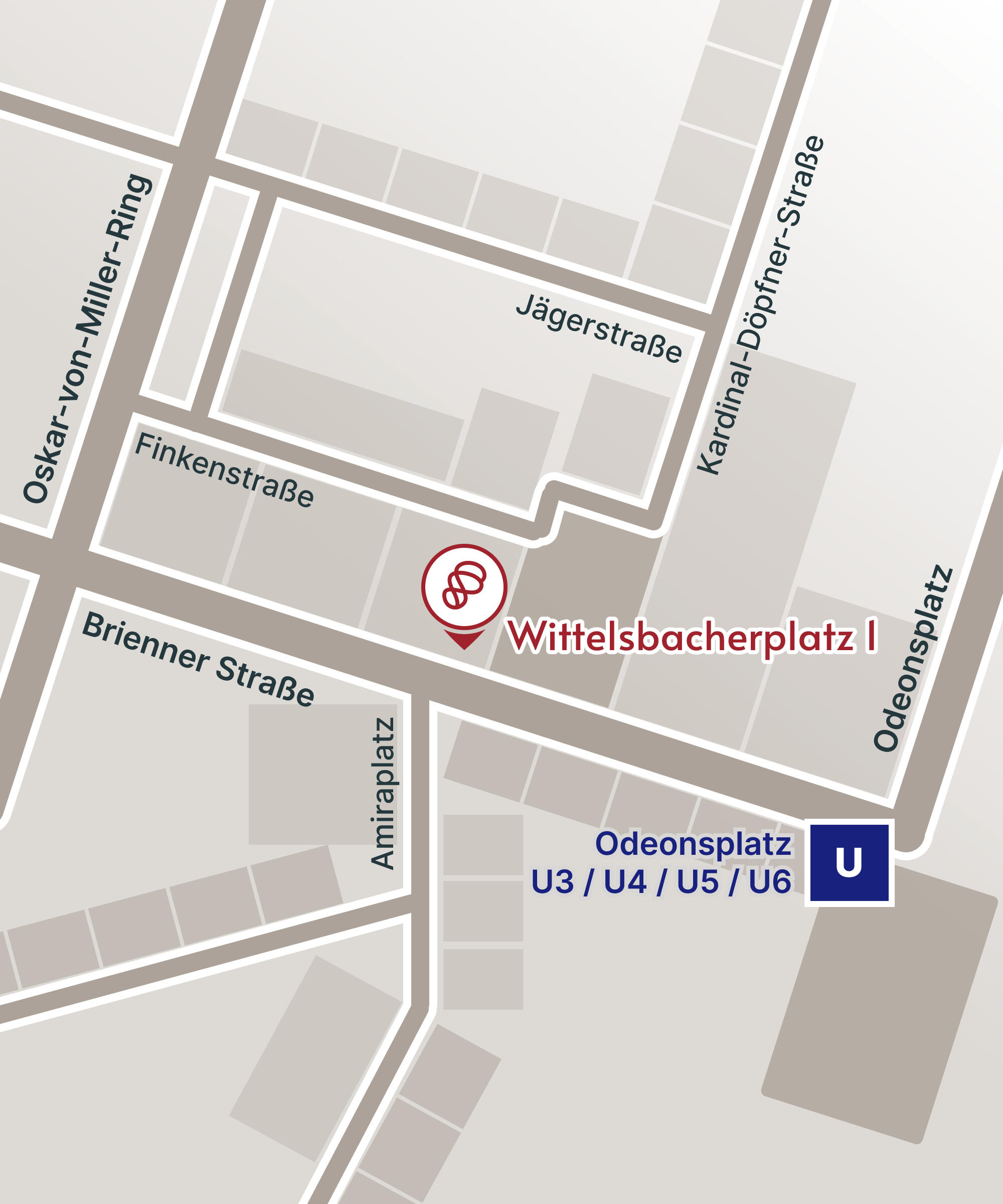 Sie erreichen uns bequem über die U-Bahnlinien U3/U4/U5/U6 Haltestelle Odeonsplatz.Ihr Auto parken Sie in den Parkzonen rund um den Wittelsbacher Platz oder im Parkhaus Salvatorstraße hinter dem Literaturhaus – zwei Gehminuten von der Praxis entfernt.